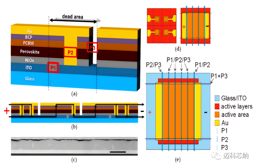 激光划线:钙钛矿模组的制备过程中,P1、P2、P3激光划线的目的是将钙钛矿电池分割成多节子电池,前一个电池的金属电极与后一个电池的ITO相连,形成串联电池,从而增大电压;激光清边:制作钙然电池过程中印刷或涂布的各个层级存在差异,利用激光刻蚀在边缘清理出1-10mm的区域,保证各层级的一致性。