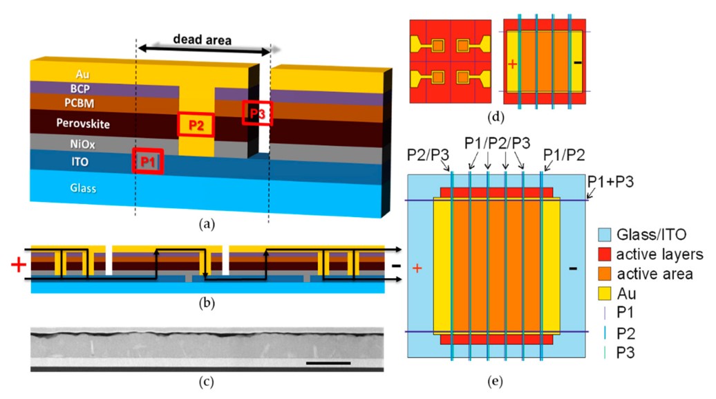 在形成钙钛矿电池的串联结构时需要对不同的功能层在不同的位置进行划线。功能层的划线可以通过掩膜版、化学蚀刻、机械或者激光划线完成。